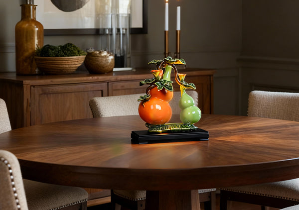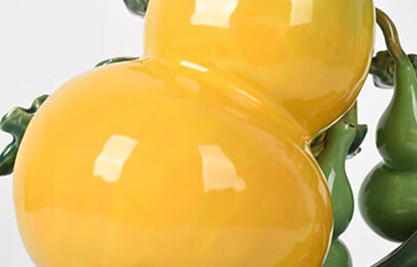 This ceramic gourd ornament showcases a form with fluid, dynamic lines and natural transitions, complemented by a brilliantly colored glaze that is layered to achieve a translucent depth. The surface presents a flawlessly smooth texture with a soft, warm luster, embodying a masterful ceramic artistry.