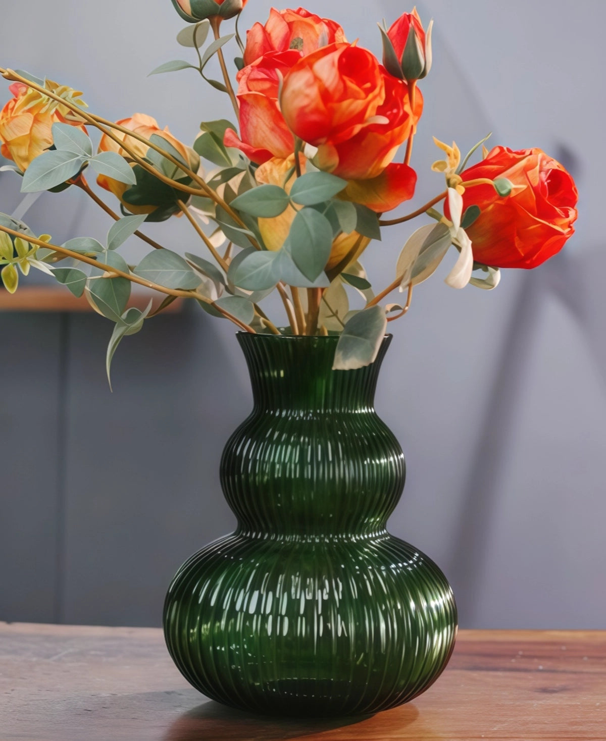 Add a pop of vintage color with this emerald green glass vase. Featuring a classic double-gourd silhouette and vertical ribbed texture, its wide 8cm mouth is perfect for lush bouquets or roses. Standing 21cm tall, this sturdy vessel makes a stunning dining table centerpiece.