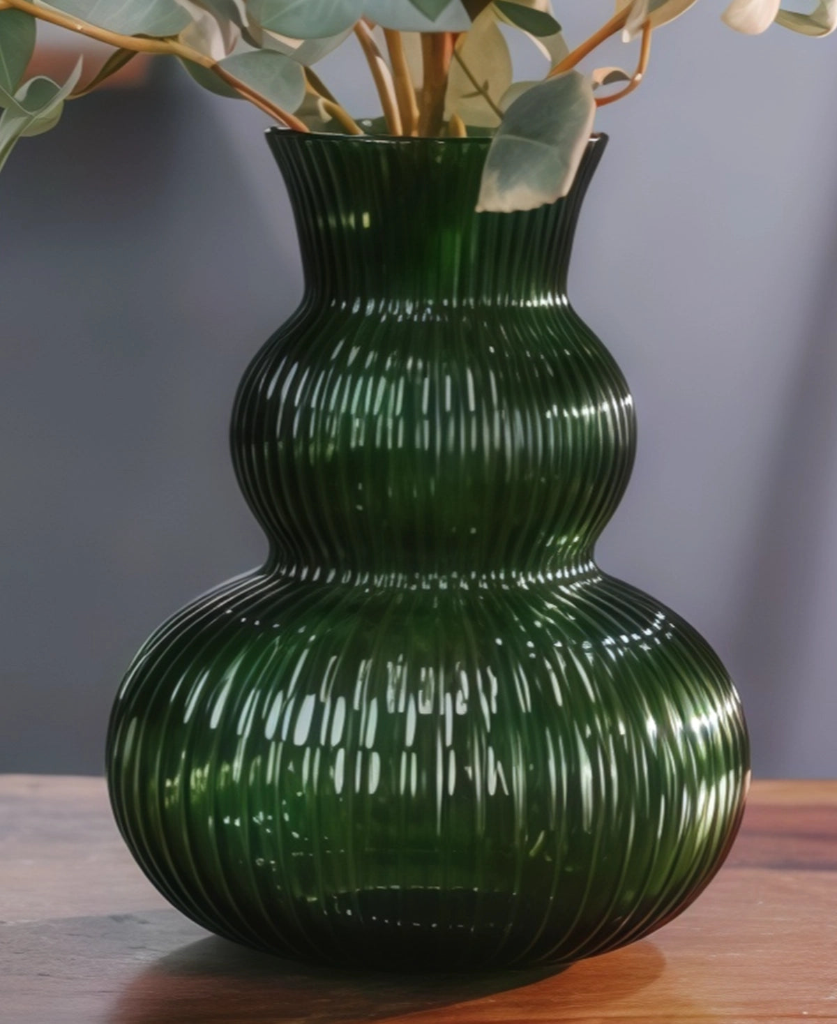 Emerald Green Ribbed Glass Vase - 21cm Fluted Gourd Flower Vessel