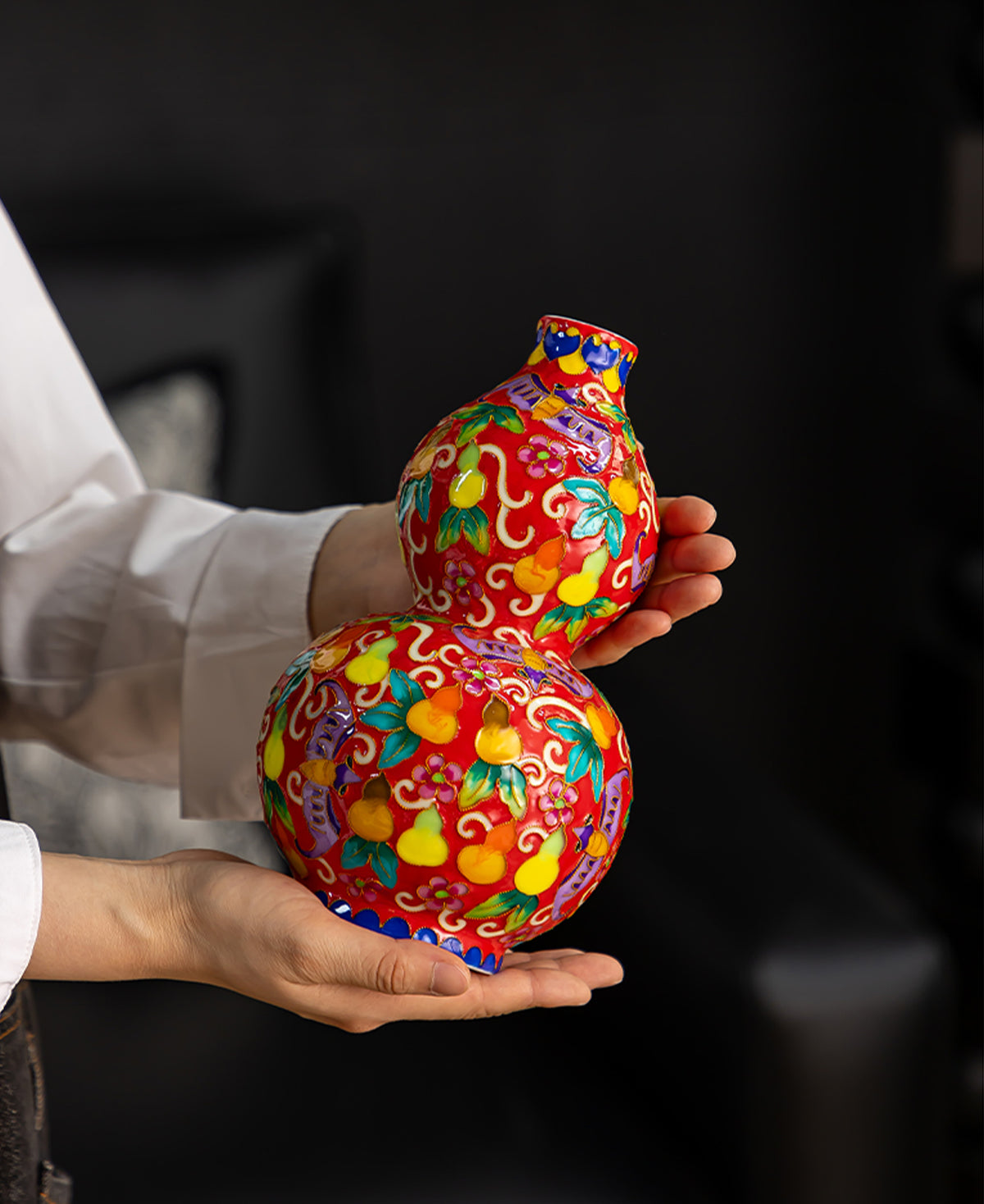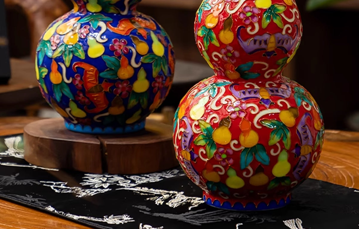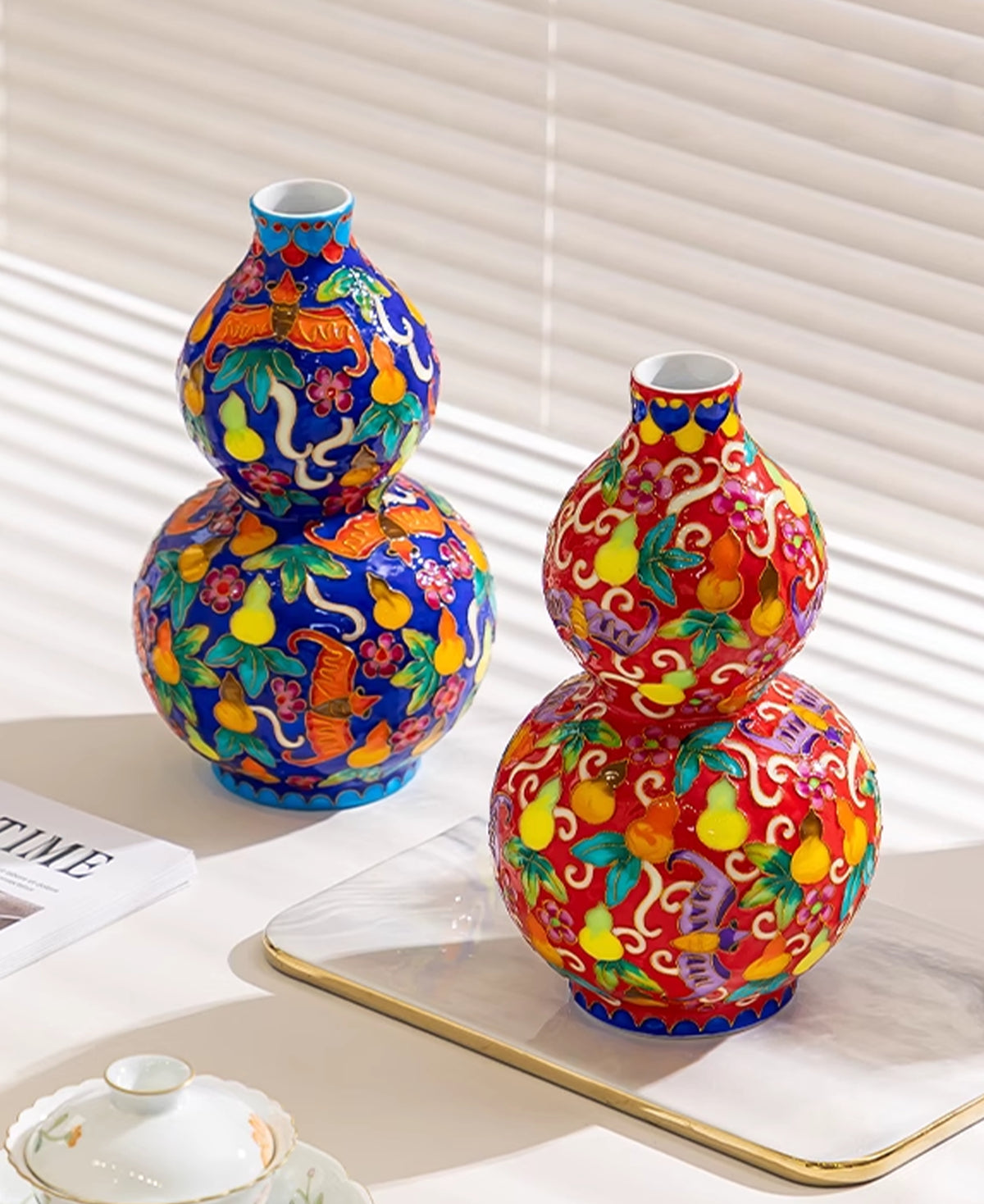 This exquisite decor is handcrafted. Featuring the classic double gourd shape, each vase is meticulously painted with vibrant Cloisonné enamel motifs of bats and gourds, symbolizing blessings and fortune. Fired at 1350°C, they boast a luminous glaze. This unique, luxury ornament adds a profound touch of Oriental artistry to modern interiors.