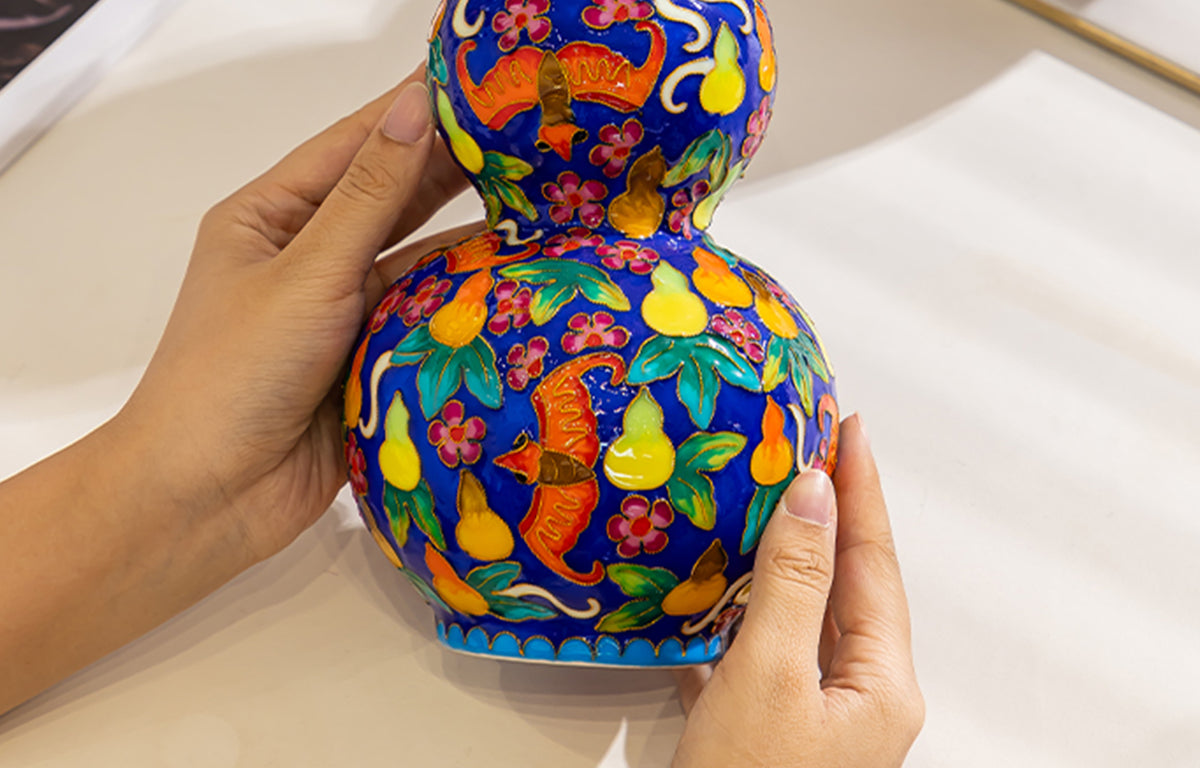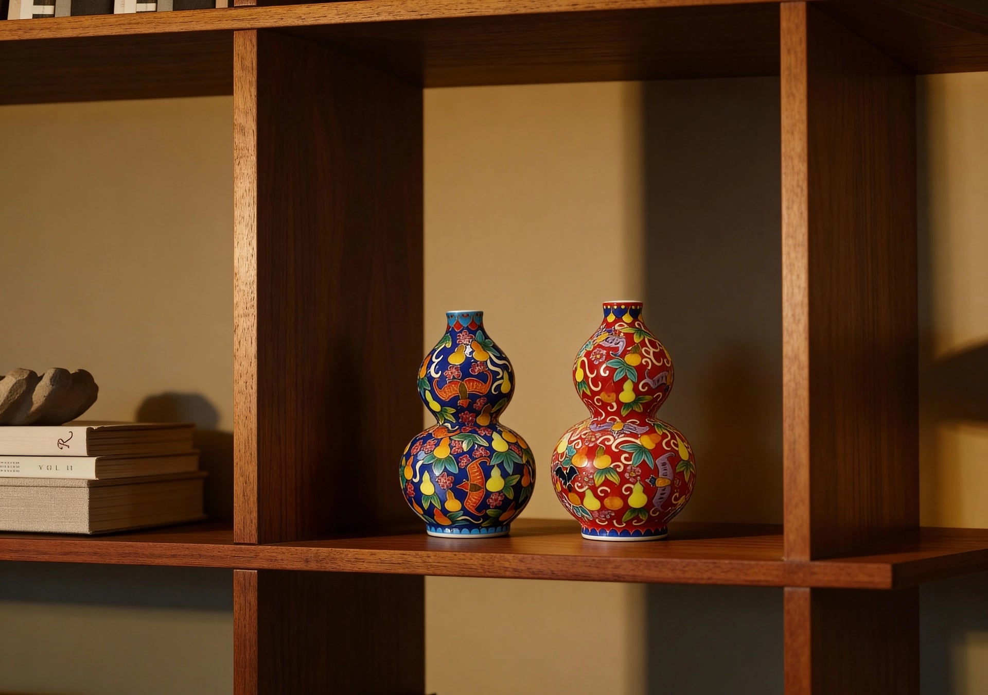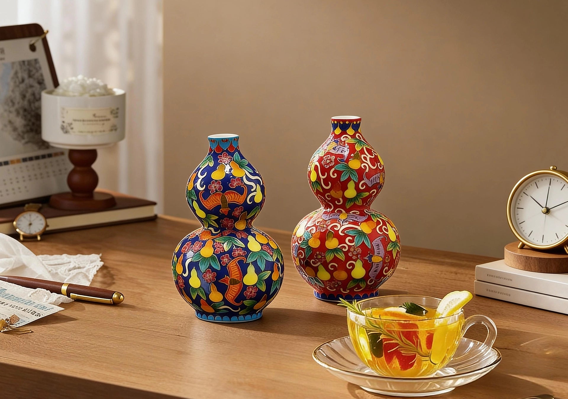 This exquisite decor is handcrafted. Featuring the classic double gourd shape, each vase is meticulously painted with vibrant Cloisonné enamel motifs of bats and gourds, symbolizing blessings and fortune. Fired at 1350°C, they boast a luminous glaze. This unique, luxury ornament adds a profound touch of Oriental artistry to modern interiors.