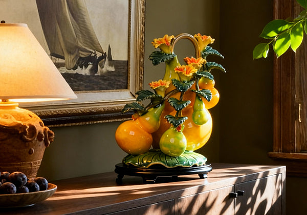 This hand-sculpted gourd ornament embodies prosperity and family harmony. The cluster of five gourds, ranging in size and hue from vibrant orange to gentle green, is adorned with delicate leaves and an elegantly arched handle. Meticulously crafted using traditional ceramic techniques, it showcases a rich, glossy glaze that highlights its organic form. A timeless piece of art, it brings a touch of natural elegance and symbolic blessing to any living room, entryway, or study shelf. An ideal gift for housewarmings or family celebrations, representing unity and abundance.