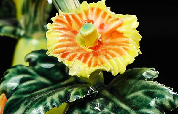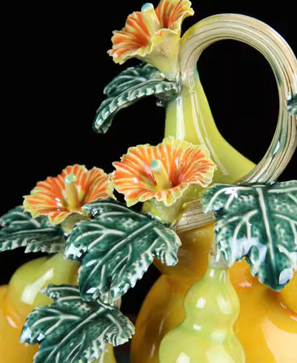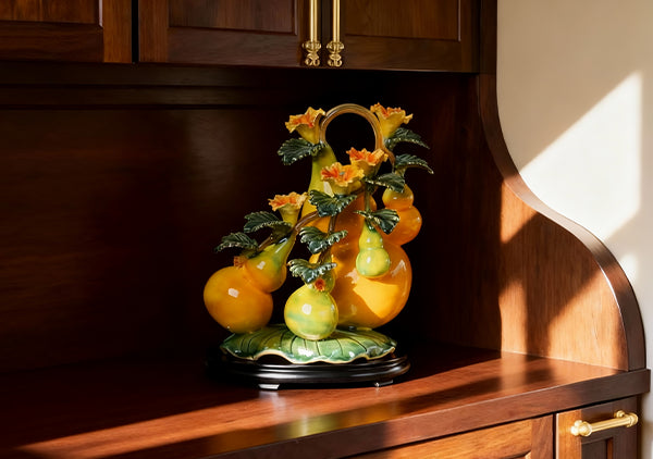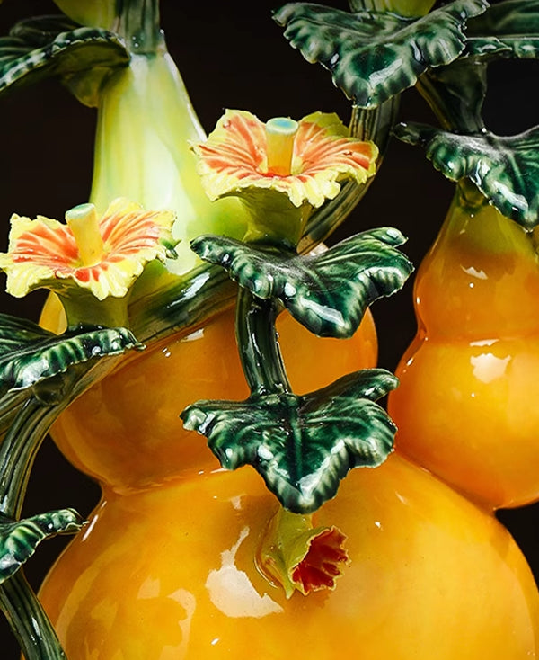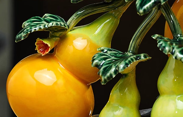 This ornament is crafted from premium ceramic clay and fired with artisanal skill, resulting in a texture that is exceptionally smooth and warm to the touch. The plump form of the gourd, the natural vines, and the vivid floral details—each vein in every leaf, the shape of each blossom—are rendered with lifelike clarity, showcasing the luxurious quality of the ceramic material. Placed on a desk, it offers a dual pleasure: the soothing smoothness of ceramic under your fingers and the vibrant elegance of art before your eyes, a true testament to refined craftsmanship and material excellence.