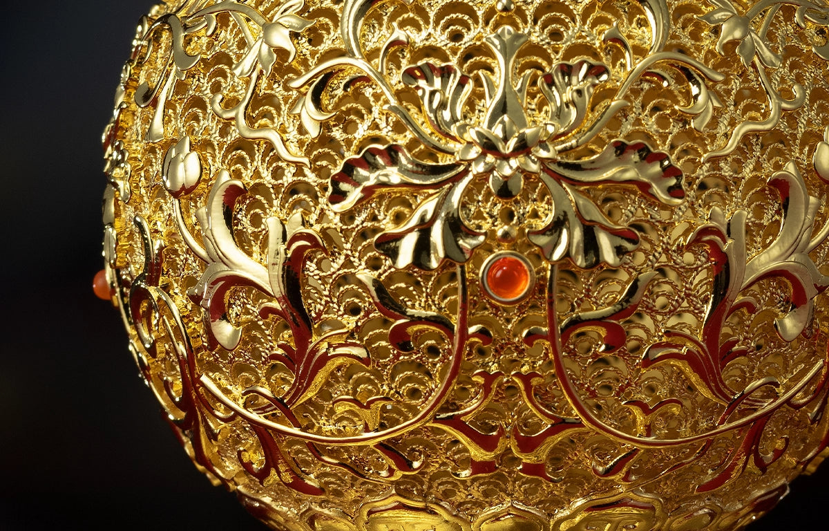 Crafted using the ancient "Lost-Wax Casting" technique, typically reserved for fine jewelry. Hand-set with natural Red Agate and bathed in 24K gold, each vessel undergoes a ruthless inspection where nearly half are rejected. We do not sell sculptures; we present the flawless survivors of our craft.