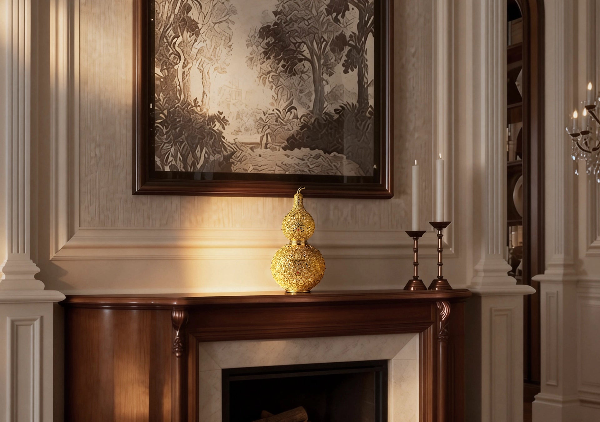 Drawing from the archives of imperial aesthetics, our London studio reimagined the ancient curve. The result is a mastery of "openwork filigree"—a 'breathable' sculpture that captures light and casts intricate, dancing shadows. A perfect fusion of regal history and modern architectural form.
