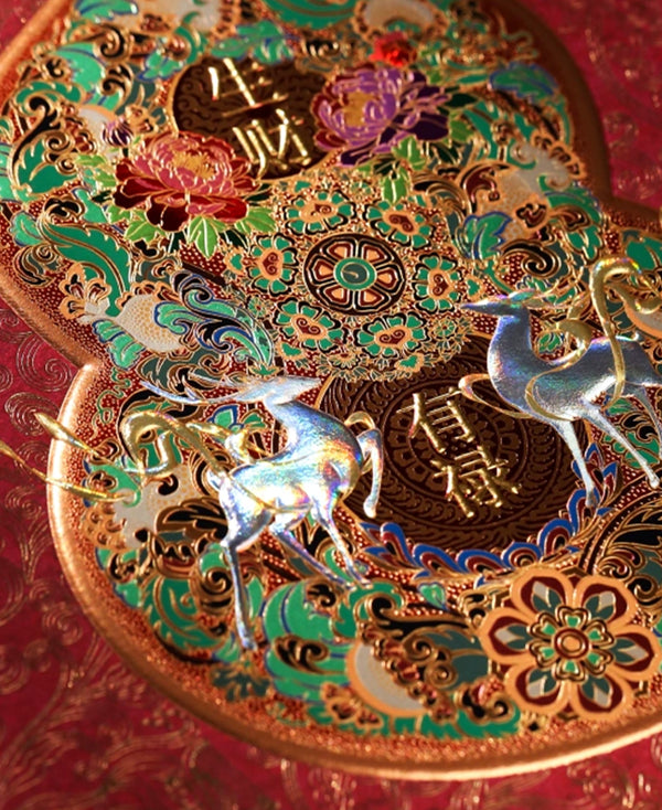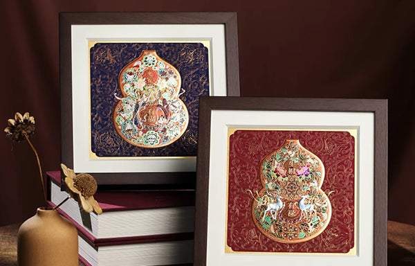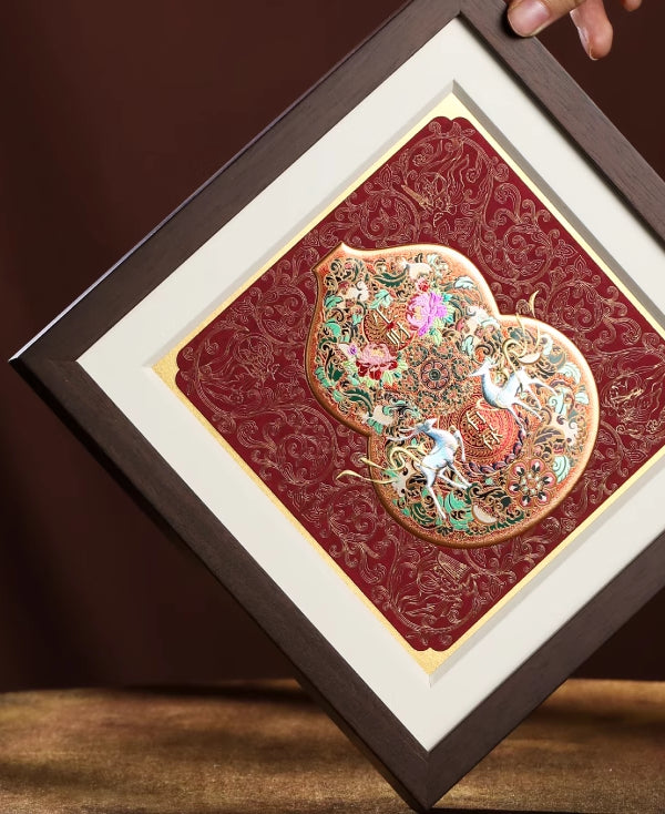 This gourd-shaped framed print is crafted on premium specialty art paper, featuring a bas-relief hot foil stamping process. It brings to life classic Dunhuang motifs like the Nine-Colored Deer, Feitian (Flying Apsaras), and interlocking lotus scrolls in the palette of the grottoes, seamlessly blending aesthetic appeal with collectible value.