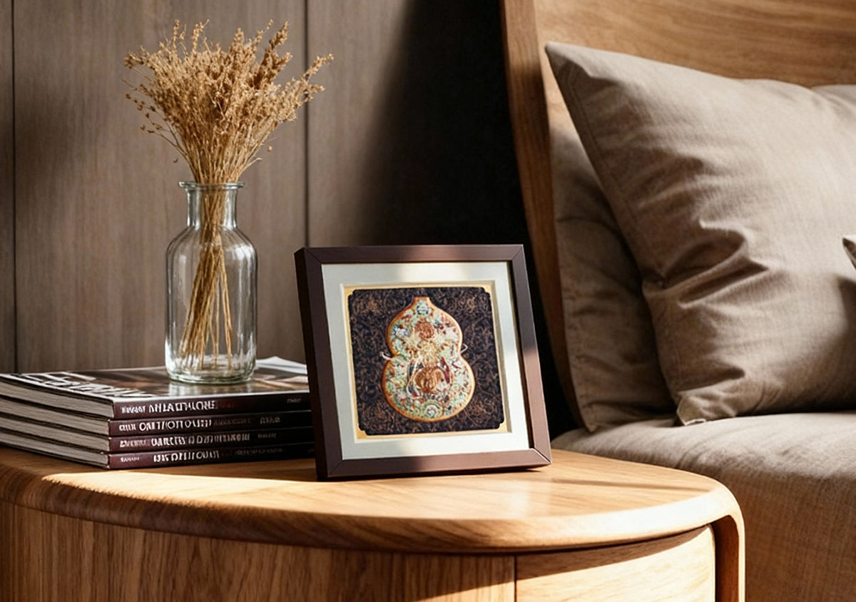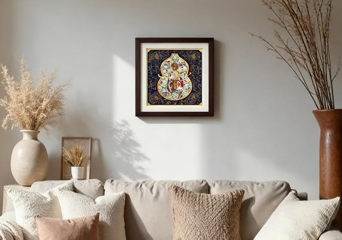 Anchored by a deep navy and burgundy background of poised elegance, the gourd print brings classic Dunhuang motifs to life. Its rounded form and rich cultural aura allow it to stand as a striking focal point, while also harmonizing beautifully with books and greenery to create a serene space with a whisper of poetry.