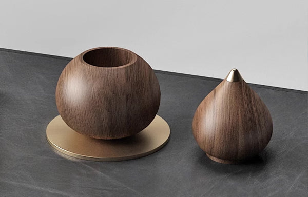 Turned from solid blocks of North American black walnut or beech wood, this piece showcases natural woodgrain and a smooth, warm touch. Complemented by a finely crafted brass gourd spout and detachable base, it balances practicality with metallic elegance. Designed to absorb up to 10ml of essential oil, the fragrance seeps naturally through the wood’s pores, blending the material’s subtle scent with the oil’s aroma for a serene, lingering effect. The lacquer version further embodies heritage craftsmanship—each coat applied by hand over 100 days through 30 meticulous steps, resulting in a translucent, multi-layered finish that makes every piece a one-of-a-kind artisanal treasure.