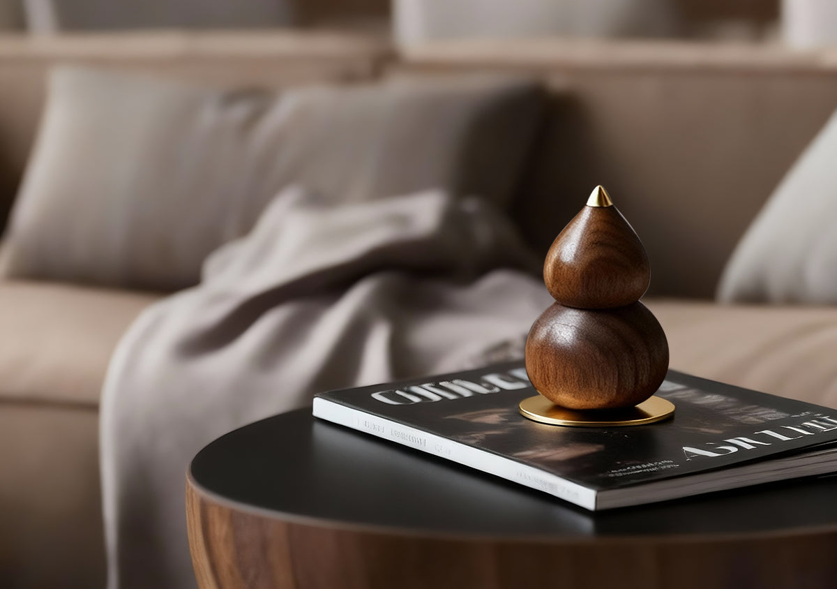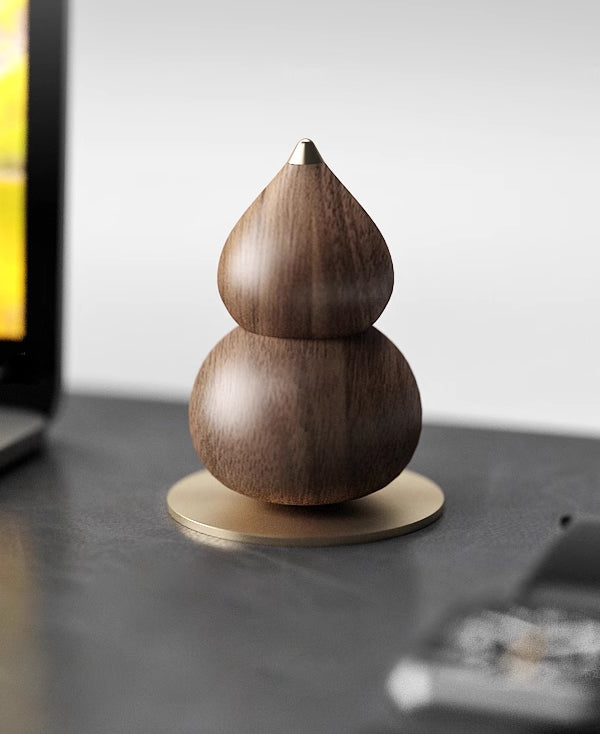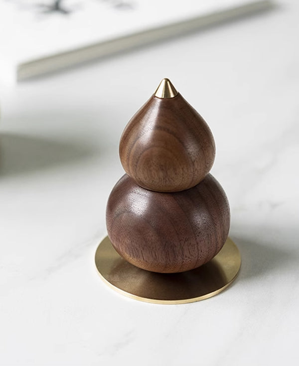 Crafted as a handmade wooden gourd fragrance diffuser, this piece is turned from solid North American black walnut or beech wood, equipped with a detachable brass base and spout, and features a built-in essential oil absorption structure. Through multiple stages of hand-polishing, it achieves a glazed ceramic-like lacquer finish, serving as an elegant home accessory that blends aesthetic appeal with practical functionality.