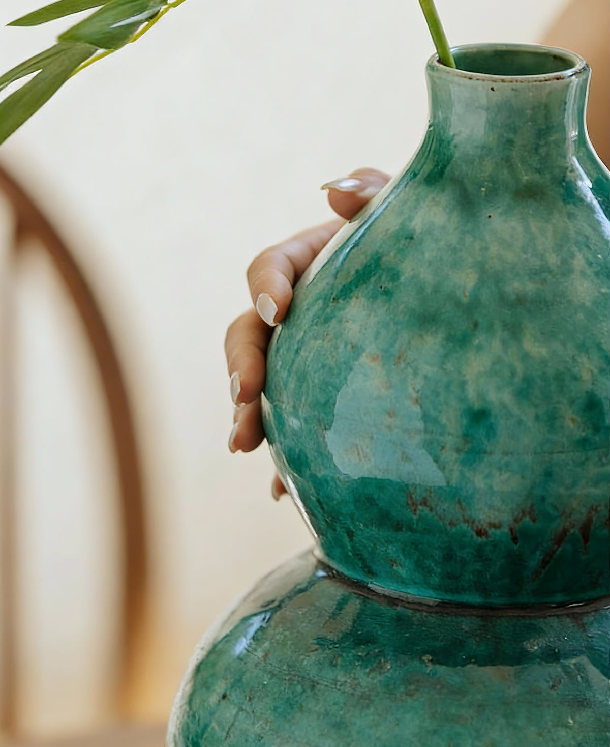 Inspired by the double gourd, this handcrafted porcelain vase symbolizes luck. It features a unique flowing celadon glaze and natural crackle texture. Each piece is one-of-a-kind, perfect for flowers or as a standalone decor, adding elegant artistry to any space.