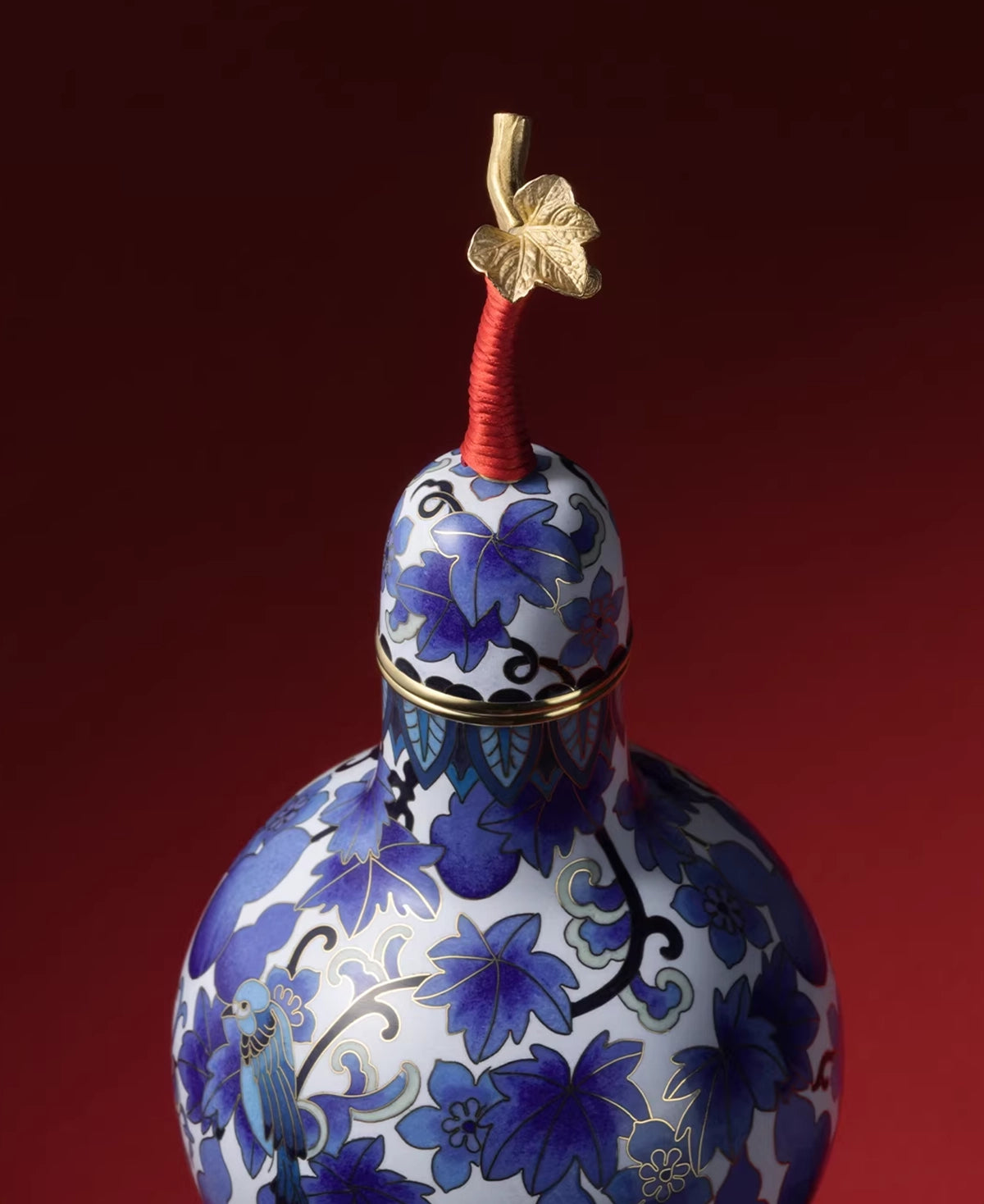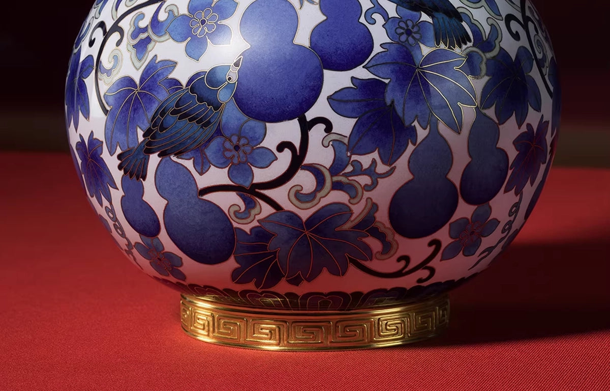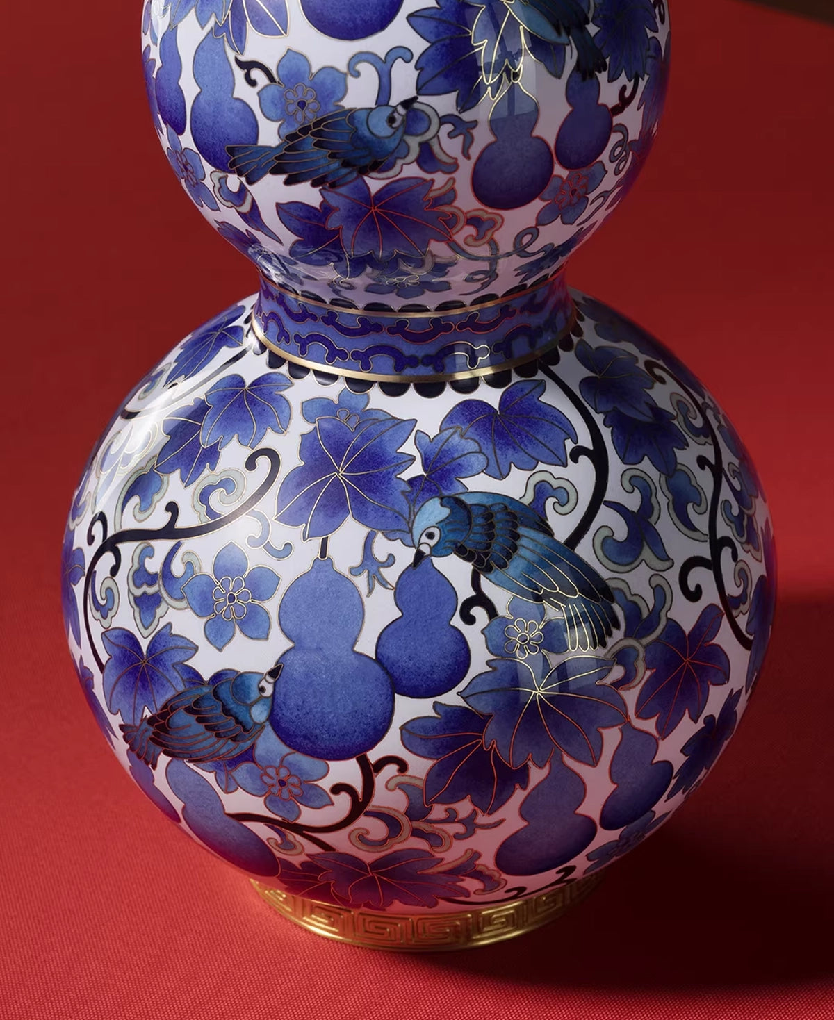A masterpiece of classic Cloisonné artistry. Hand-forged from solid copper and adorned with "Real Gold Gilded" wire, this vessel features a serene motif of magpies and gourds amidst winding vines. The deep imperial blue hue and the elegant silhouette symbolize peace, joy, and everlasting fortune.