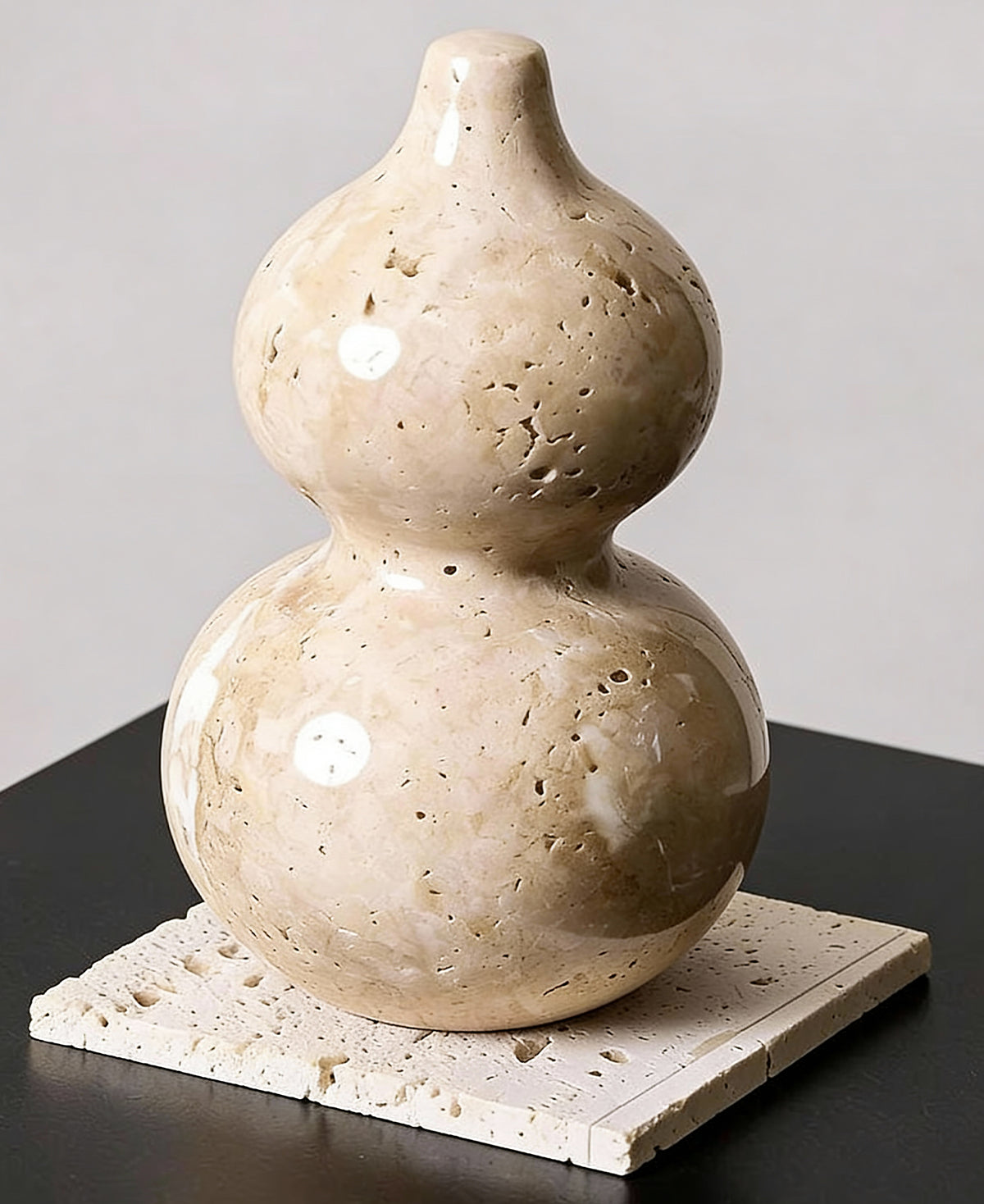 This unique double gourd ornament is meticulously hand-carved from natural travertine marble, featuring distinctive beige tones and rich, organic veins. Each piece is one-of-a-kind, celebrating the raw beauty of stone. Perfect for adding a touch of natural elegance to your shelf, desk, or home altar. Its rustic texture and minimalist form bring serene, earthy energy to any space.