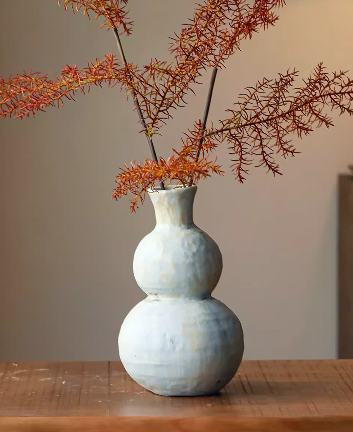 Embrace authentic rustic charm with this handcrafted ceramic gourd vase. Made from high-quality kaolin clay with a distressed, weathered finish, this 21cm tall vessel embodies the Wabi-sabi aesthetic. Its narrow 3cm mouth is perfect for dried branches or single-stem minimalism.